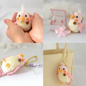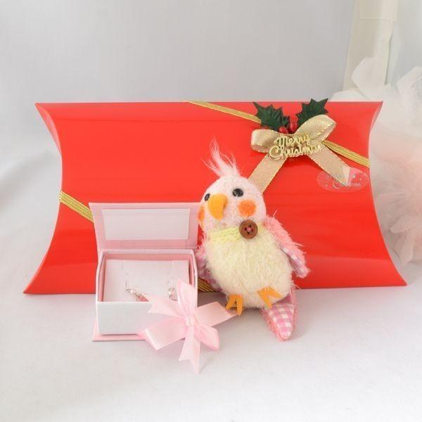 可愛い鳥さんのチャームストラップと幸せのピンクの羽のピアスがリボンケースに入ってクリスマスラッピング♪