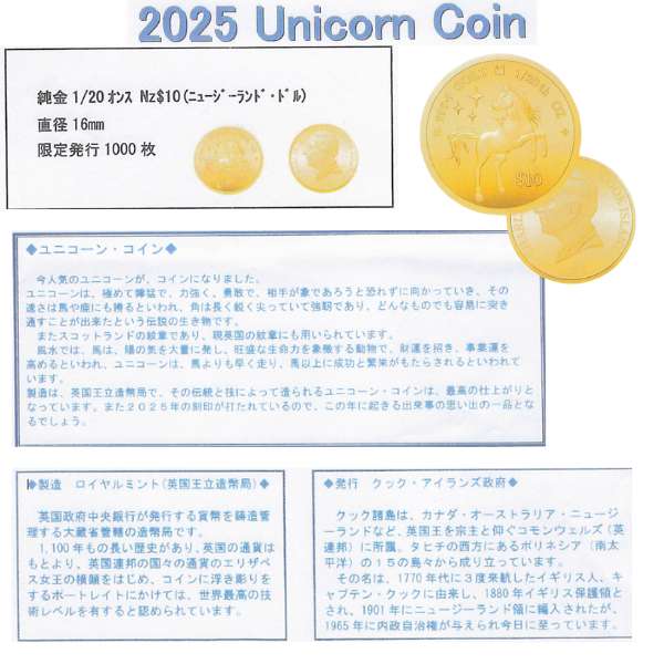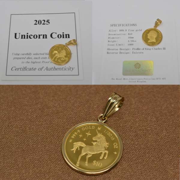 20分の1オンス ペンダント ユニコーン 金貨 1/20oz 2025年製 イギリス王室造幣局 保証書 クック諸島